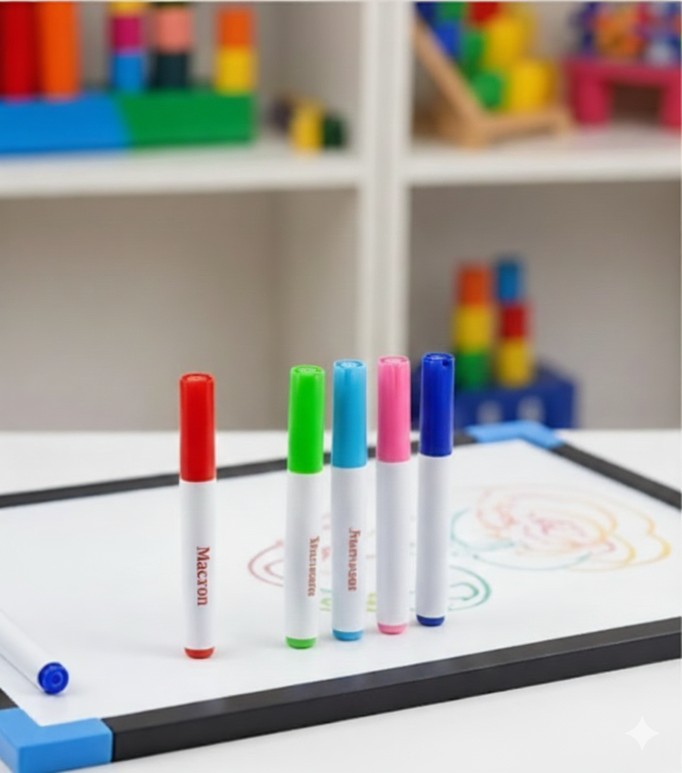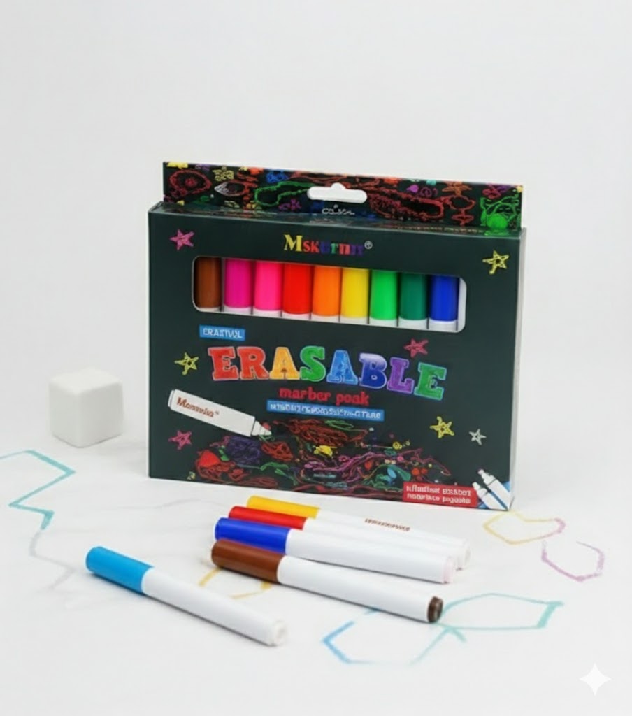 This is a set of 12 vibrant, erasable markers perfect for a wide range of creative and educational projects. These markers are designed for use on non-porous surfaces, making them ideal for writing and drawing on whiteboards, glass, mirrors, and smooth blackboards. They feature easy-to-erase ink that leaves no ghosting or residue, ensuring a clean surface after every use. The individual markers are designed with a smooth, comfortable barrel (approximately 12-14 cm in height) for effortless grip, and each color offers a high-opacity, smooth ink flow, making them a versatile tool for students, artists, and professionals alike.