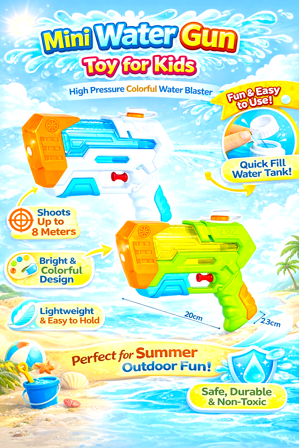 Make summer playtime more exciting with this Kids Mini Water Gun Toy Set, designed for endless outdoor fun and refreshing water battles. These high-pressure colorful water blasters are perfect for boys and girls who love active games during hot weather. Whether it’s a backyard water fight, pool party, beach vacation, or Holi celebration, this mini water gun set brings joyful entertainment and nonstop laughter.