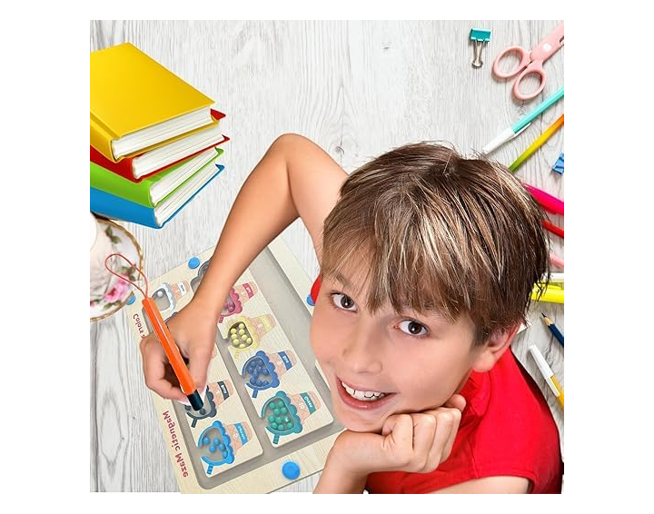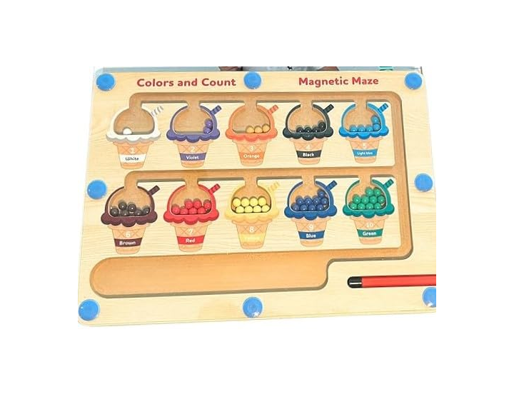 Arka Introduce your little one to the delightful world of colours and counting with this engaging ice cream-themed magnetic maze board. The sorting maze features ten vibrant ice cream cones, each representing different colours including white, violet, orange, black, turquoise, brown, red, yellow, blue, and green. This educational wooden puzzle board helps develop essential skills like colour recognition, counting, and hand-eye coordination. Perfect for children aged 3-5 years, this Montessori-inspired learning toy includes a magnetic wand that makes learning fun and interactive. The sturdy wooden construction ensures durability, while the magnetic balls add an element of excitement as children guide them through the maze. This versatile educational tool combines play with learning, making it an excellent choice for both home and classroom use. The large, easy-to-handle pieces are designed specifically for little hands, promoting fine motor skills development while keeping young minds engaged.
