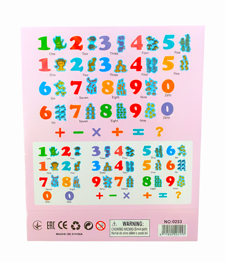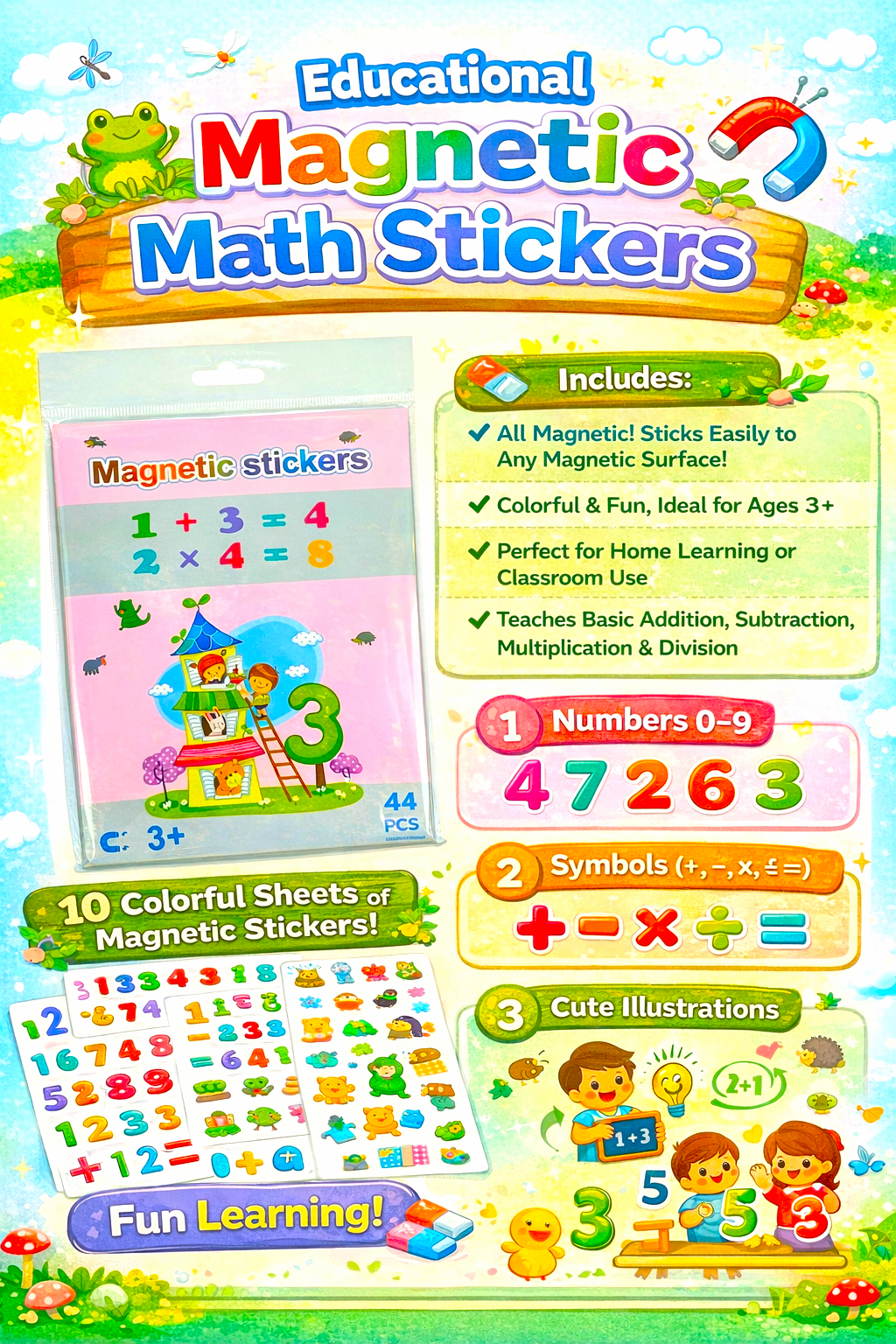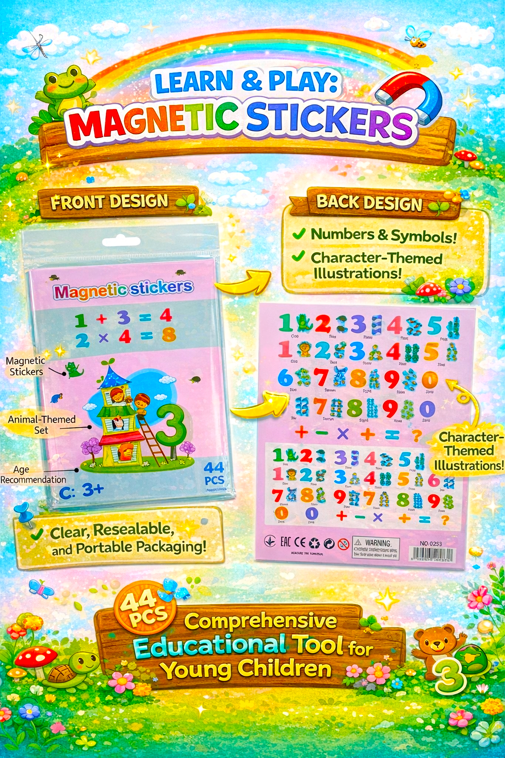 This magnetic sticker set is designed to make early learning fun and engaging for young children. It features colorful numbers from 0 to 9 along with basic math symbols such as plus, minus, multiply, divide, and equals. The bright designs and child-friendly shapes help kids easily recognize numbers and symbols while enjoying playful learning activities at home or school.