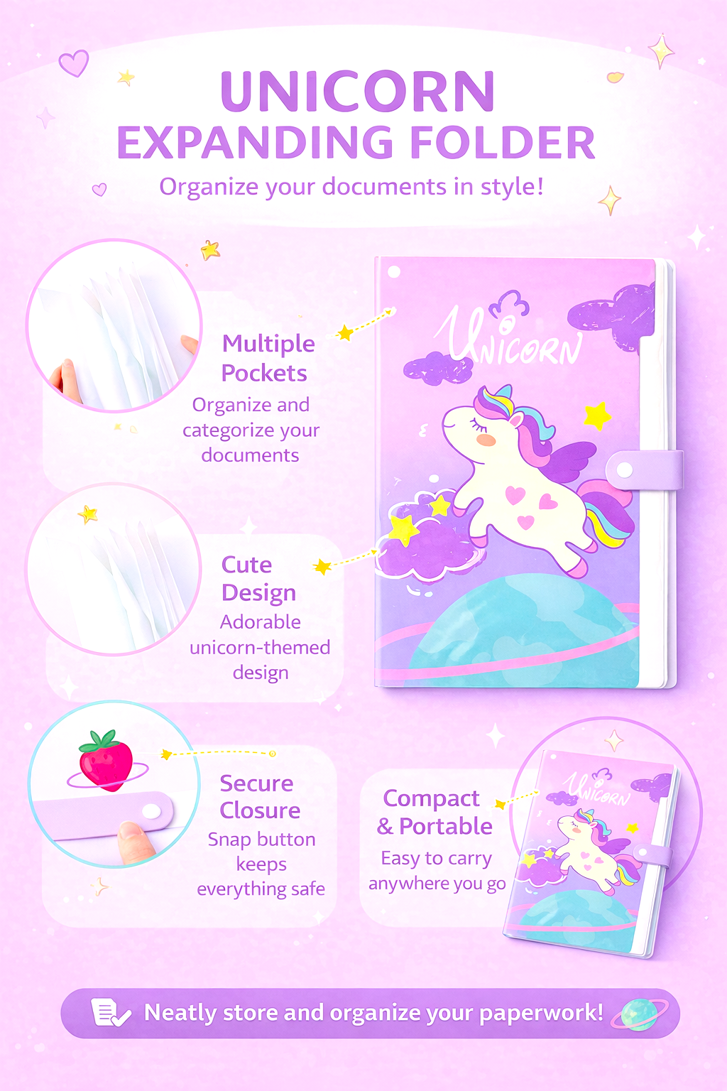 Perfect for students, parents, and teachers, this unicorn expanding folder is both practical and stylish. It helps children develop good organizational habits while adding a touch of fun to their daily routine. Whether used for schoolwork, creative projects, or document storage, it offers a reliable and attractive solution for keeping papers neatly arranged.